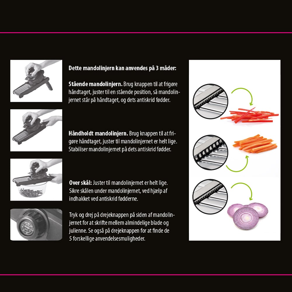 Tryk og drej på drejeknappen på siden af mandolinjernet for at skrifte mellem almindelige blade og julienne. Se også på drejeknappen for at finde de 5 forskellige anvendelsesmuligheder.