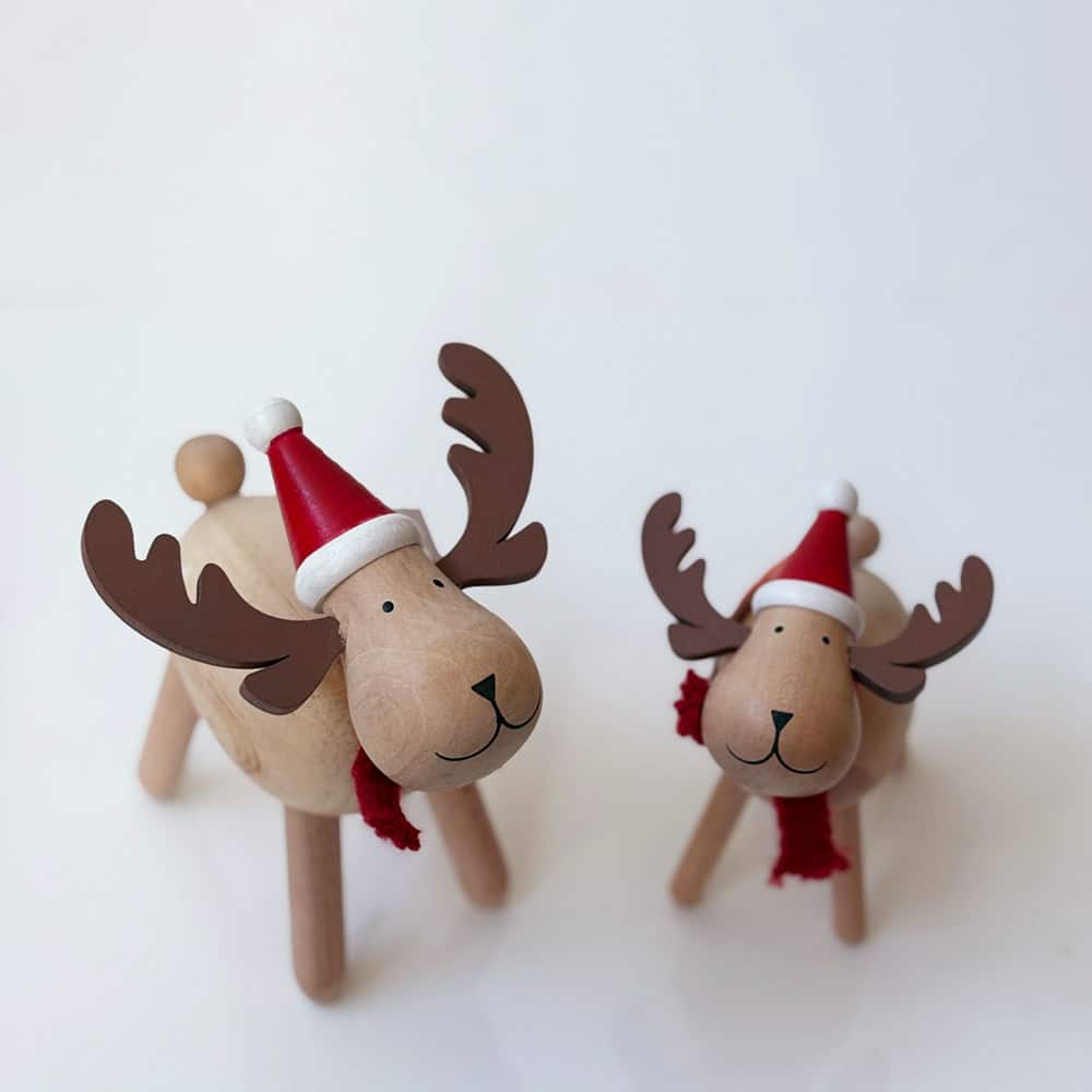 Sødt rensdyr med nissehue fra Dacore i fyrretræ – pynter og hygger.