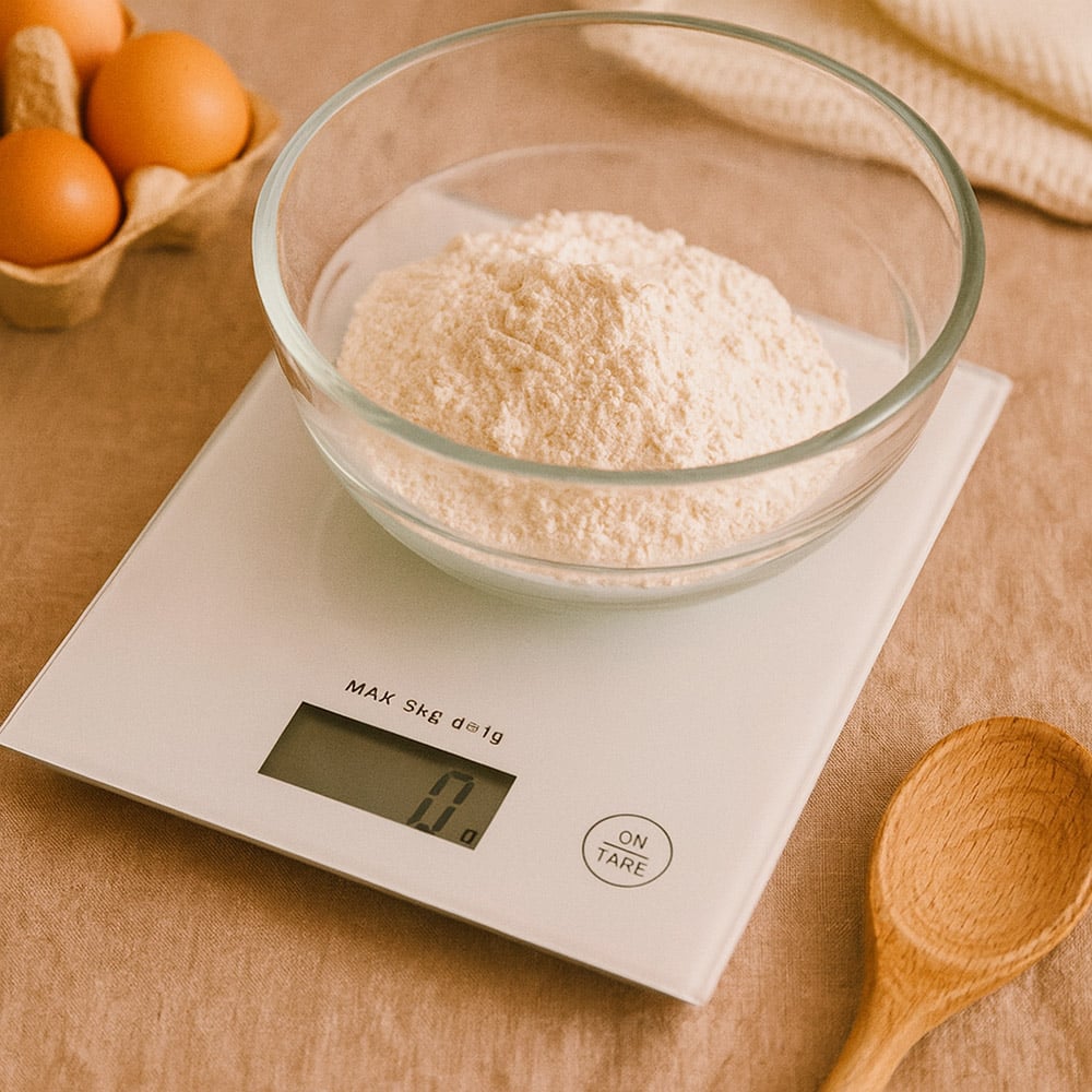 Lille elegant hvid køkkenvægt der vejer op til 5 kg med 1 grams nøjagtighed.
