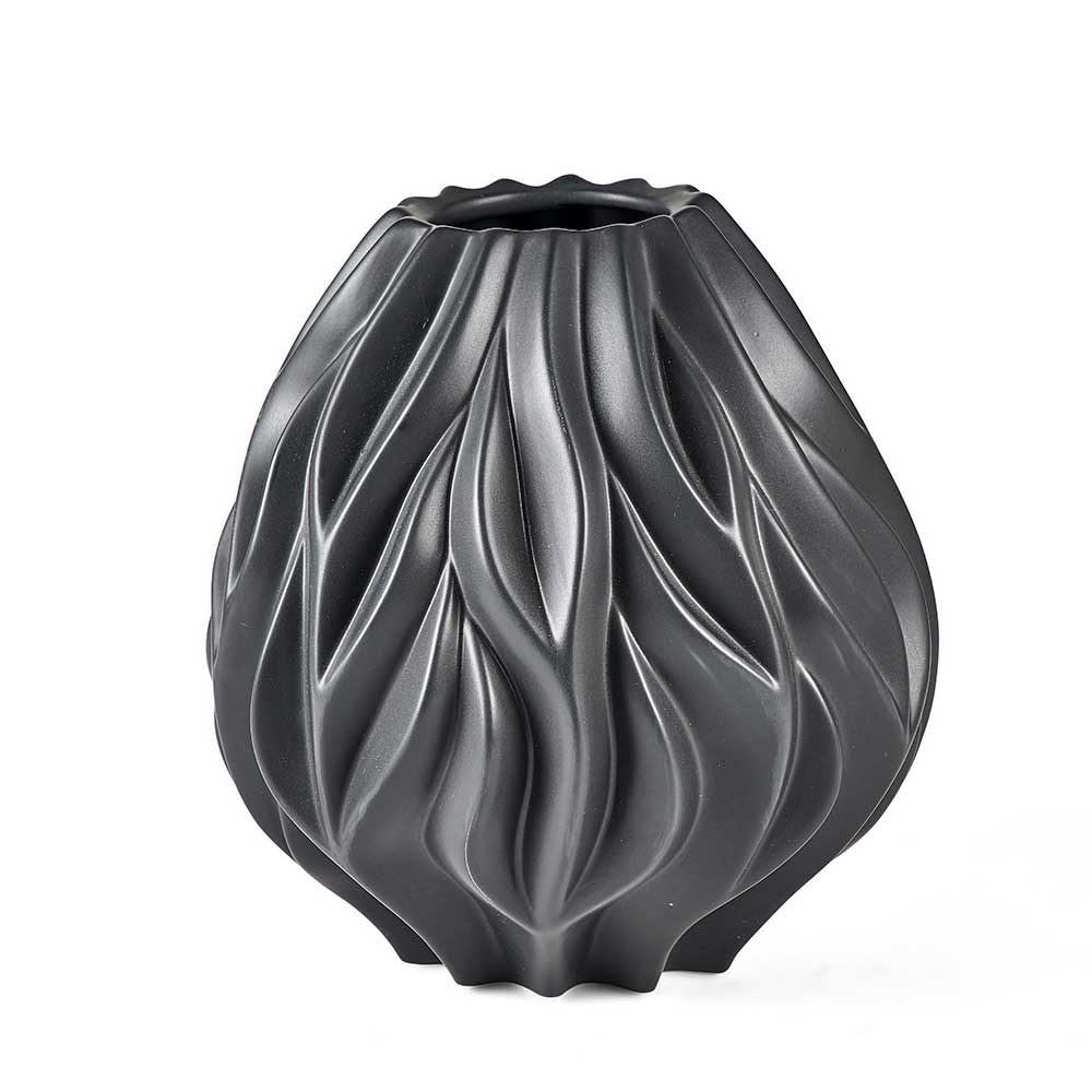Morsø Flame Vase er skabt med inspiration fra naturens dynamiske bevægelser, især ildens og flammernes organisk flydende linjer. Det spektakulære mønster med fordybninger og den matte, sorte glasur skaber et dekorativt spil af lys og skygge, som fremhæver vasens kurver og detaljer i ethvert rum.