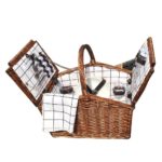 Picnickurv i pileflet med bestik og service til 2 personer. Teskeer, spiseskeer, gafler og knive med plastik skaft. Tallerkener i porcelæn, vinglas, salt og pebersæt i plastik, mundservietter samt et multiværktøj med kapselåbner, proptrækker og en lommekniv.